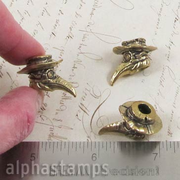 With the large vertical hole and 3D shape, this is a good bead to put a mini candle into (in a dollhouse scale Halloween scene). Approx. 1/2" tall. Antique brass color metal.