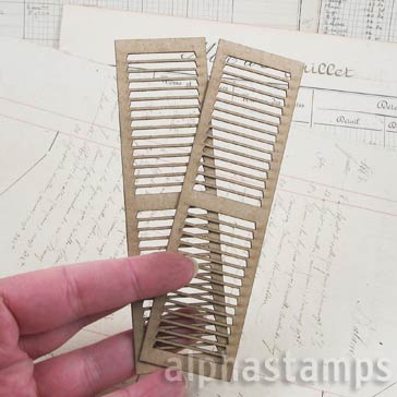 A set of lightweight, laser-cut chipboard shutters (5-1/8" tall x 1-3/8" wide).